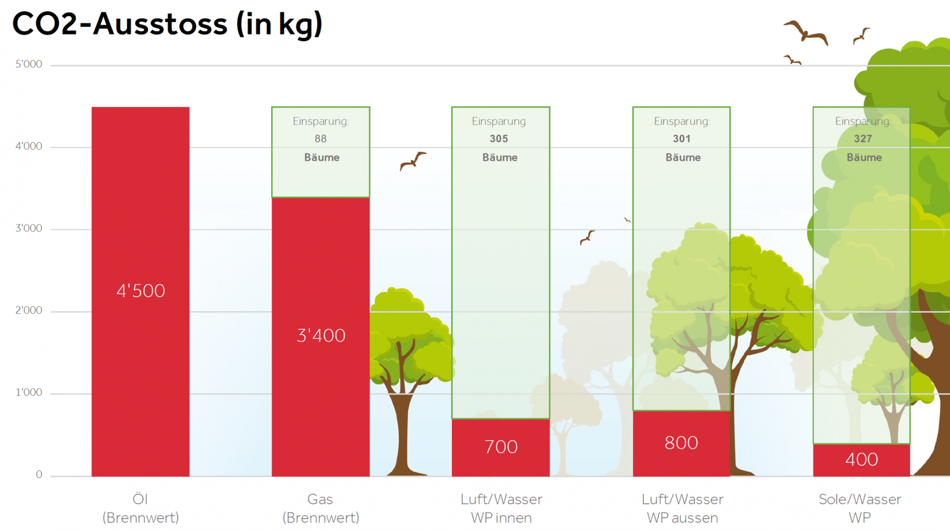 Für den durchschnittlichen Schweizer Haushalt bedeutet dies, dass mit dem Einsatz einer Erdsonden-Wärmepumpe nur rund 500kg an CO2-Ausstoss anfällt. Verglichen mit konventionellen, fossilen Heizungstypen resultiert dabei die beste Bilanz mit einem ca. 5 - 7 mal geringeren CO2-Ausstoss. In Zahlen bedeutet dies, dass bei einer Erdsonde-Wärmepumpe rund 4 Tonnen weniger CO2 in die Atmosphäre abgegeben wird.