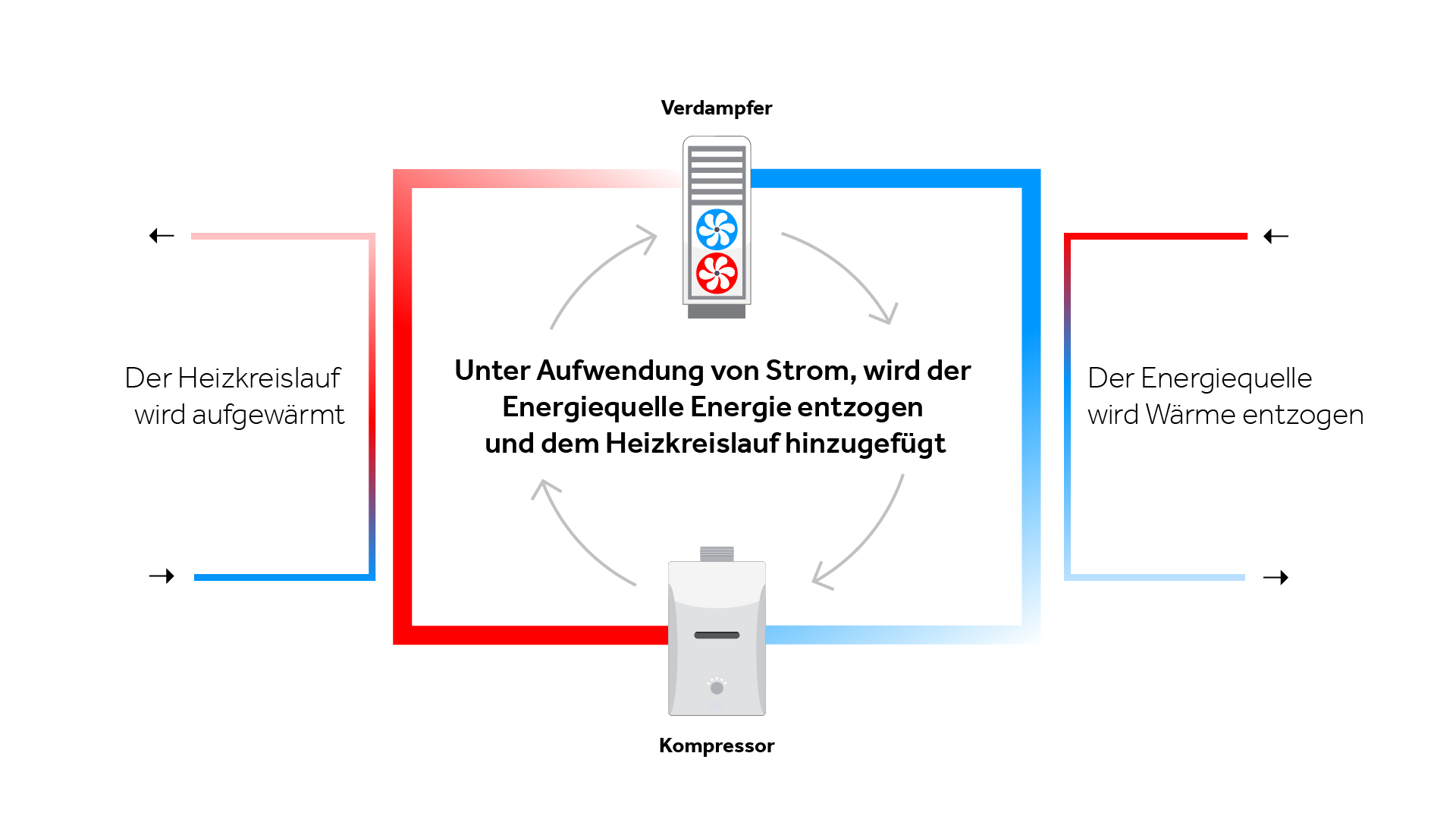 Das erwärmte, gasförmige Kältemittel wird erneut verdichtet. Der Kreislauf beginnt wieder von vorne.